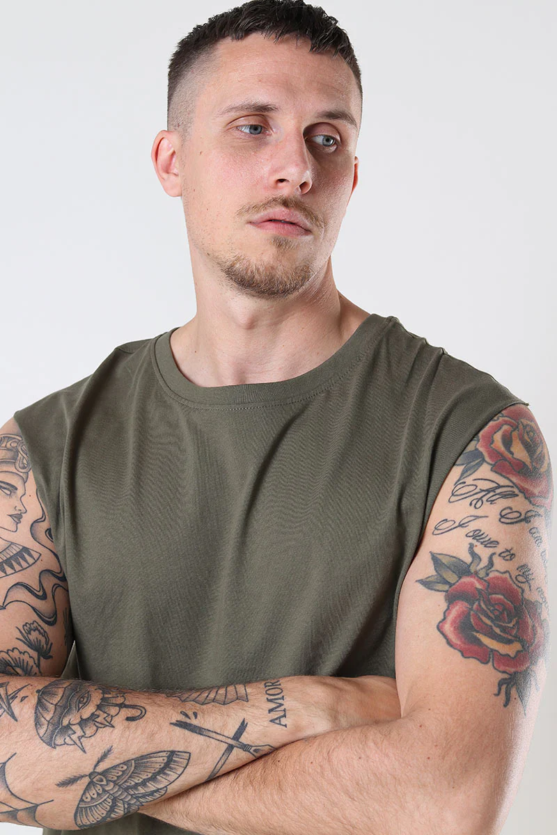 Urban Classics ærmeløs T-shirt. Kommer i olivengrøn med ribkant i halsudskæringen. Trendy detalje med ripped udskæringer ved ærmer og i bunden af t-shirten. Kvalitet: 100% bomuld.