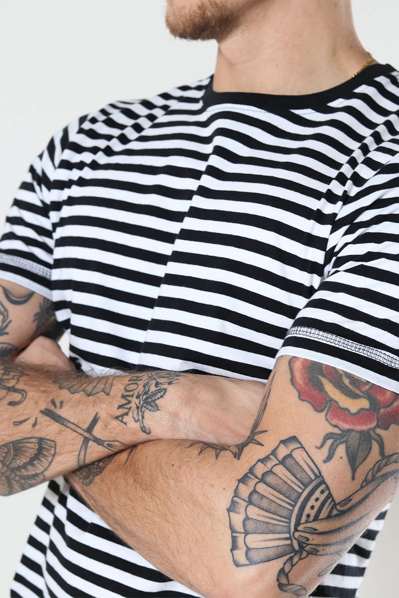 T-shirt fra Basic Brand. Kommer i sorte og hvide striber og er produceret i et lækkert blødt materiale. Har o-neck halsudskæring i sort. Kvalitet: 100% bomuld.