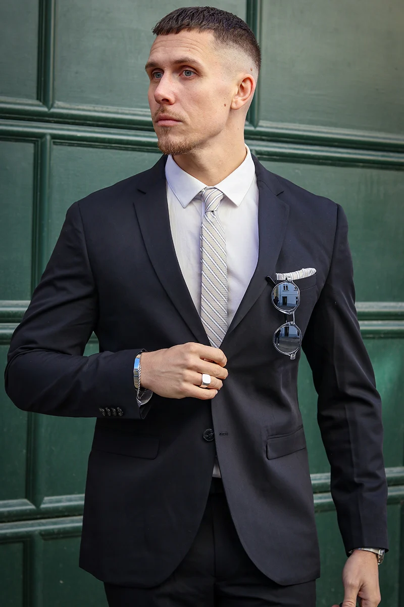 - Alsidighed: Det sorte Comfort Suit er et alsidigt køb, som kan styles på mange forskellige måder. Det kan bæres med en hvid skjorte og sort slips til en formel begivenhed, eller med en enkel t-shirt og sneakers til en mere afslappet lejlighed. Med sit klassiske design og komfortable materiale vil Comfort Suit i sort helt sikkert blive en favorit i din garderobe, der kan bruges igen og igen.